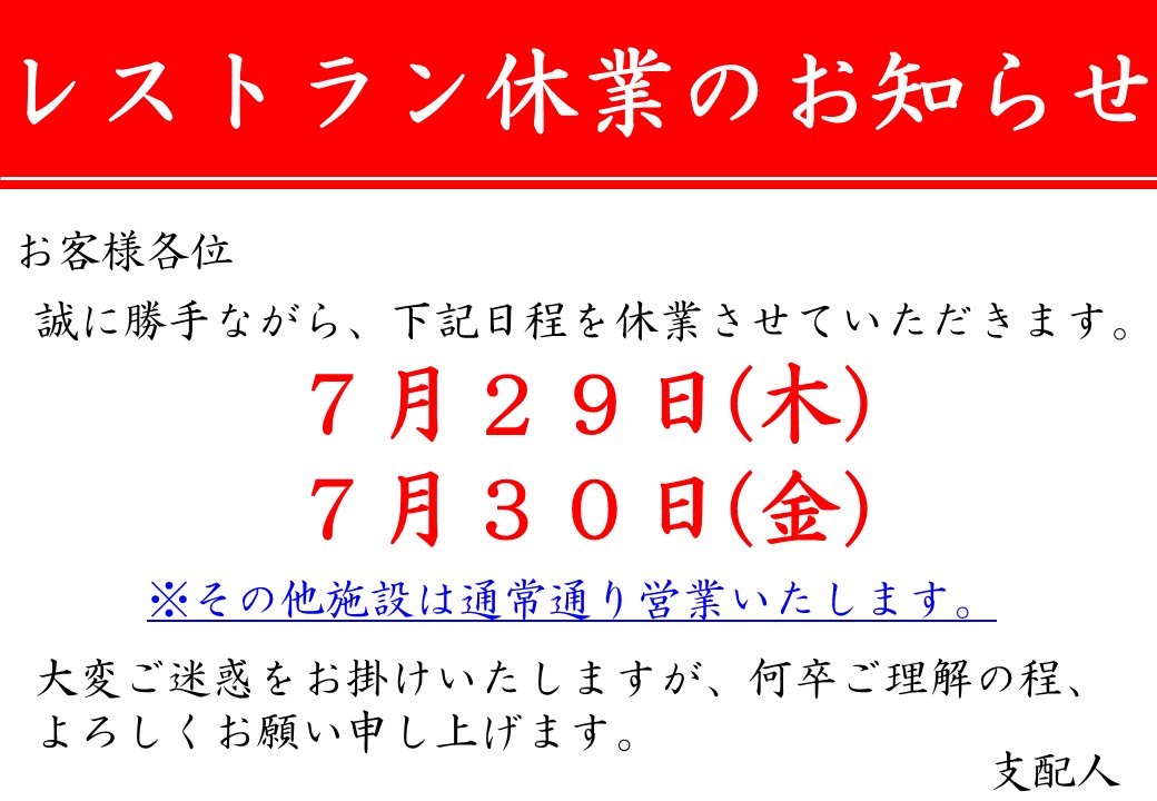 ※レストラン臨時休業のお知らせ※ 7月29日(木)、30日(金)