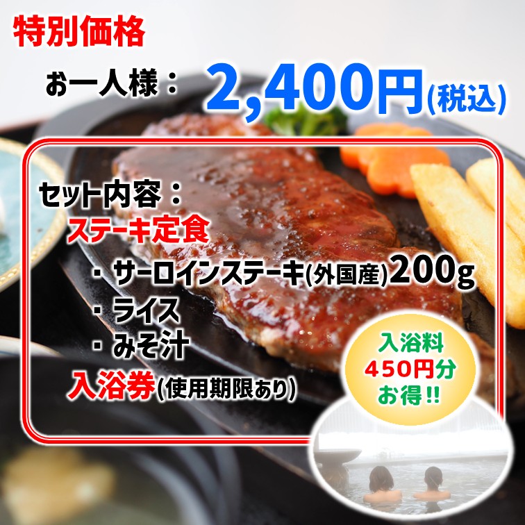 通常、ステーキ定食だけで2,400円(税込)のところ、期間中にチケットを購入していただくと「ステーキ定食+入浴券」で価格据え置きの2,400円(税込)です!(450円分お得!)
