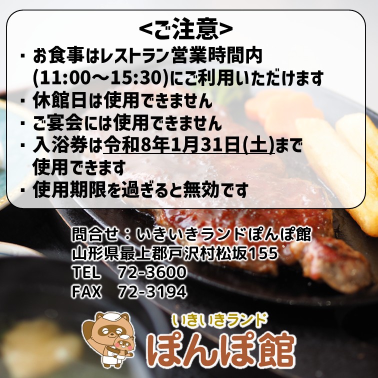 ※なお、ステーキ券はレストラン営業時間内での使用のみとなりますので、ご宴会などには使用できません。お風呂は営業時間内いつでもご使用いただけます。